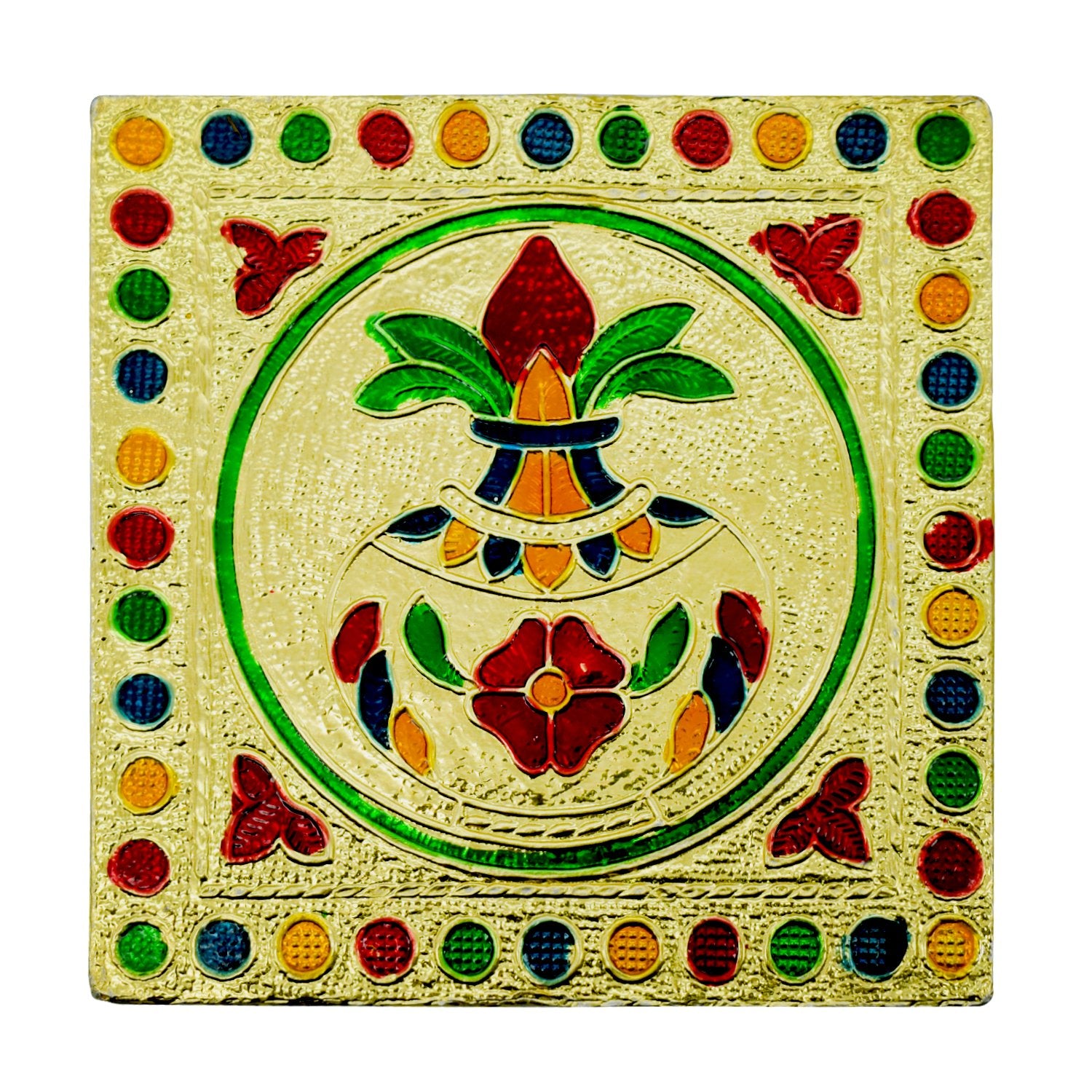 We brings to you Stylish and extravagant looking rectangle patla/ stand for Royal Weddings & Pujas. A very beautiful and unique style of minakari patla for increasing the beauty of your home. Made of wood the minakari design work gives it a different look. It can be used as a corner piece or to place god idols or to sit while performing Hindu pooja. Easily eye catching and admirable by everyone. Each piece is handcrafted and there may be a variation in colour and design