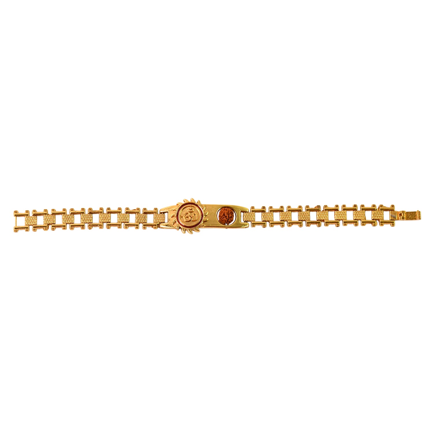 Add elegance and devotion to your Raksha Bandhan celebration with this Watch-Dial Style Bracelet Rakhi, a luxurious symbol of brotherhood and tradition. The rakhi features a beautifully engraved circular dial centerpiece with a divine Lord Krishna image, set within a sunburst bezel design for a radiant, spiritual appeal. A shimmering gold-plated interlocked bracelet chain and single red stone detail elevate its grandeur.