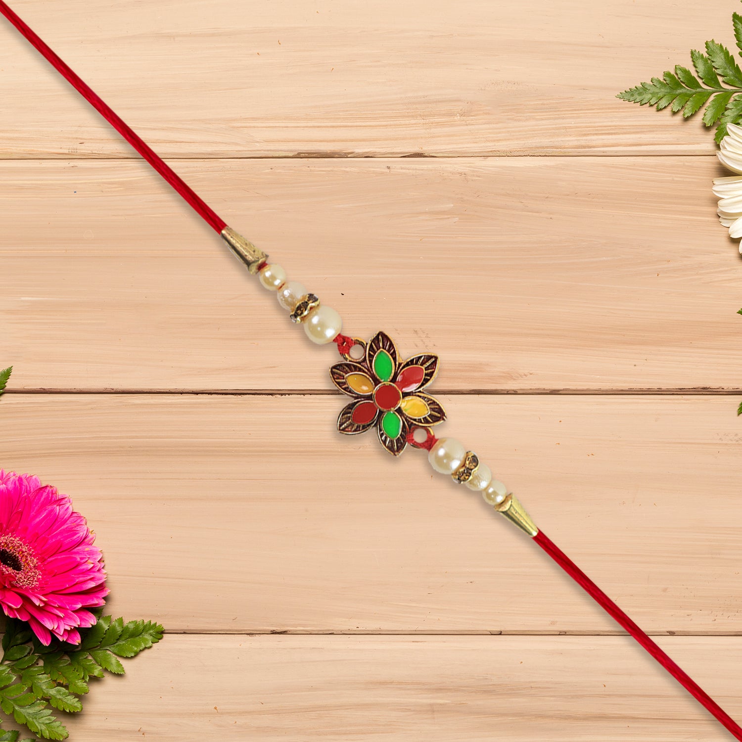Multicolor Floral Rakhi With Pearl Beads And Red Thread Festive Designer Bracelet For Raksha Bandhan