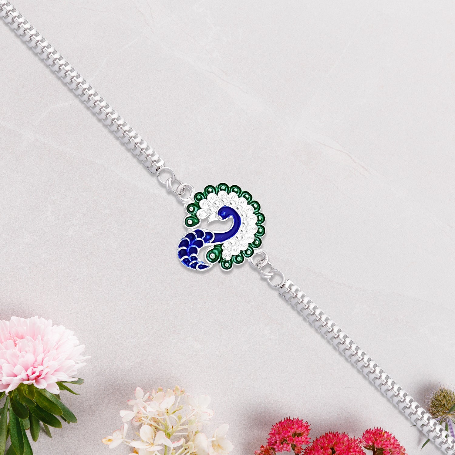 Peacock Design Metal Chain Rakhi With Blue Green And White Stone Work